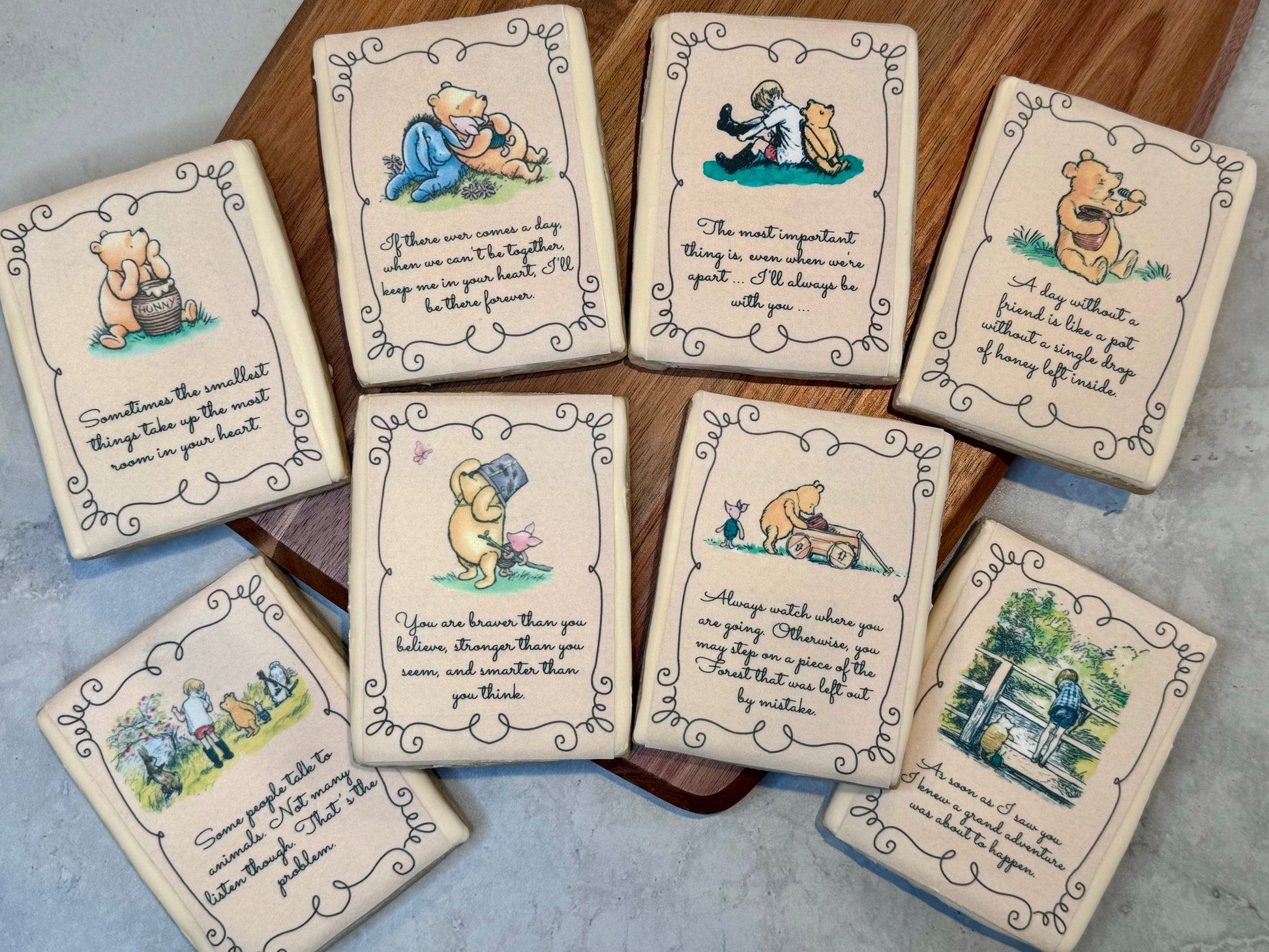 - 6 book pages (Pages are printed on icing sheets with food coloring and attached to a flooded cookie with royal icing. Each cookie will have a different page. You may request specific pages when contacted about pick up day/time. Note: color on printed images can fade when placed in sunlight)