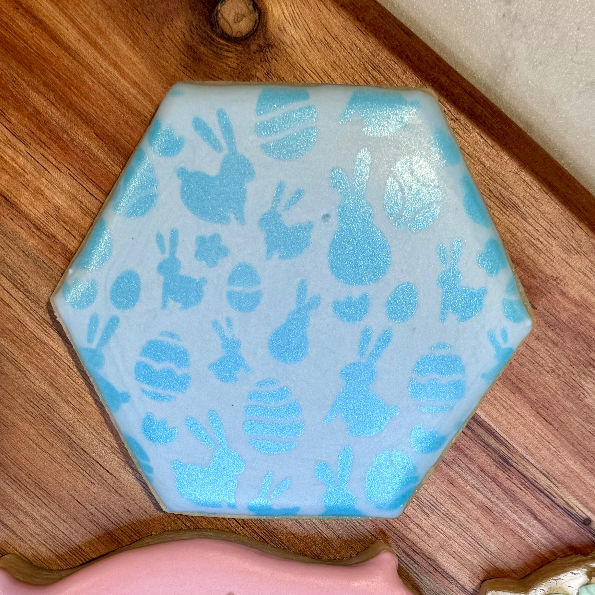 - Blue hexagon w/Easter print is approximately 3.5” x 3.2”