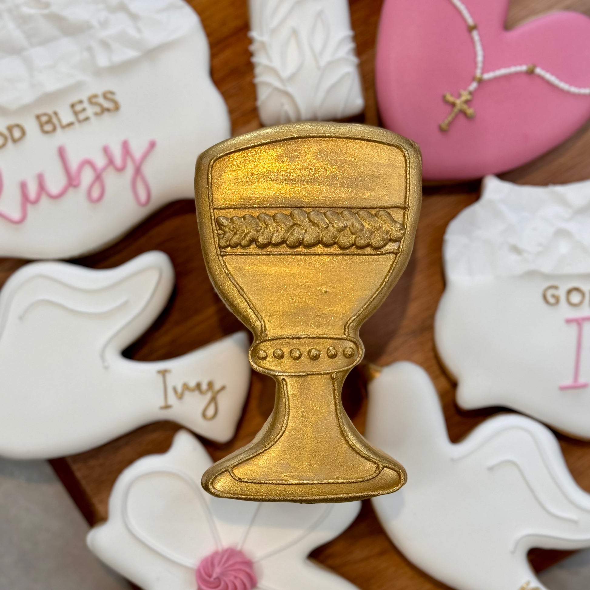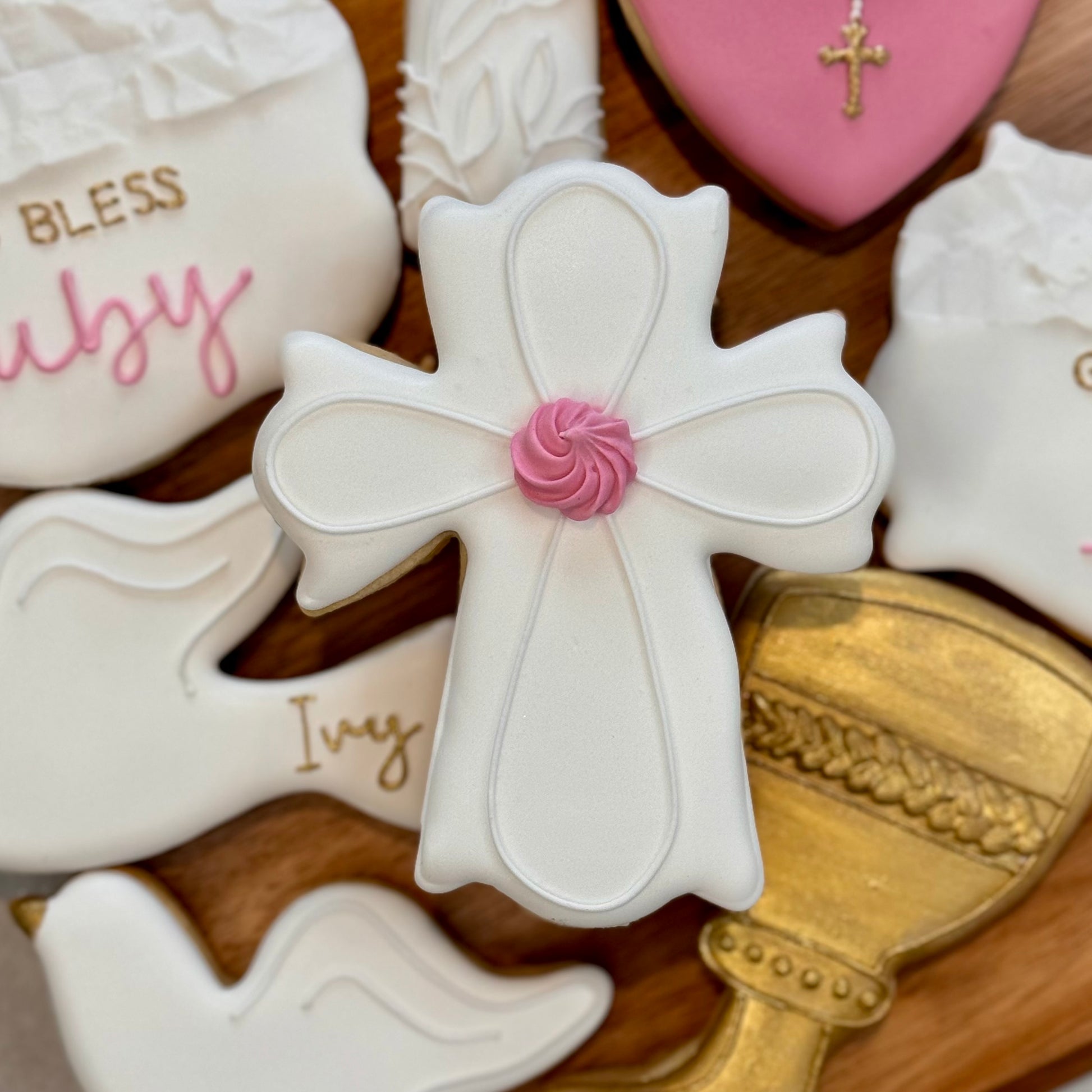 After ordering you’ll be contacted for the pick up date/time along with the name for personalization of the dove and God bless cookie. Colors can also be customized.