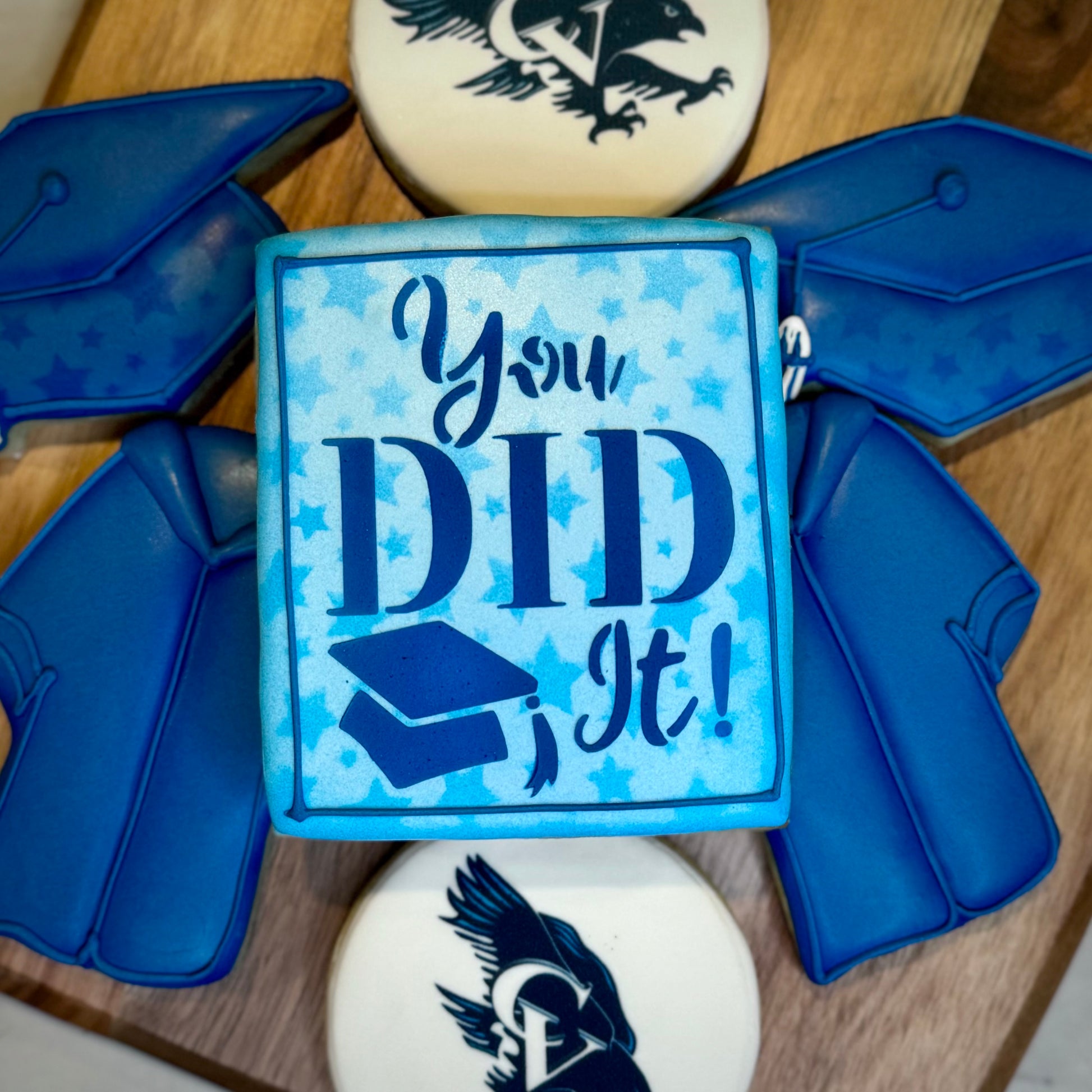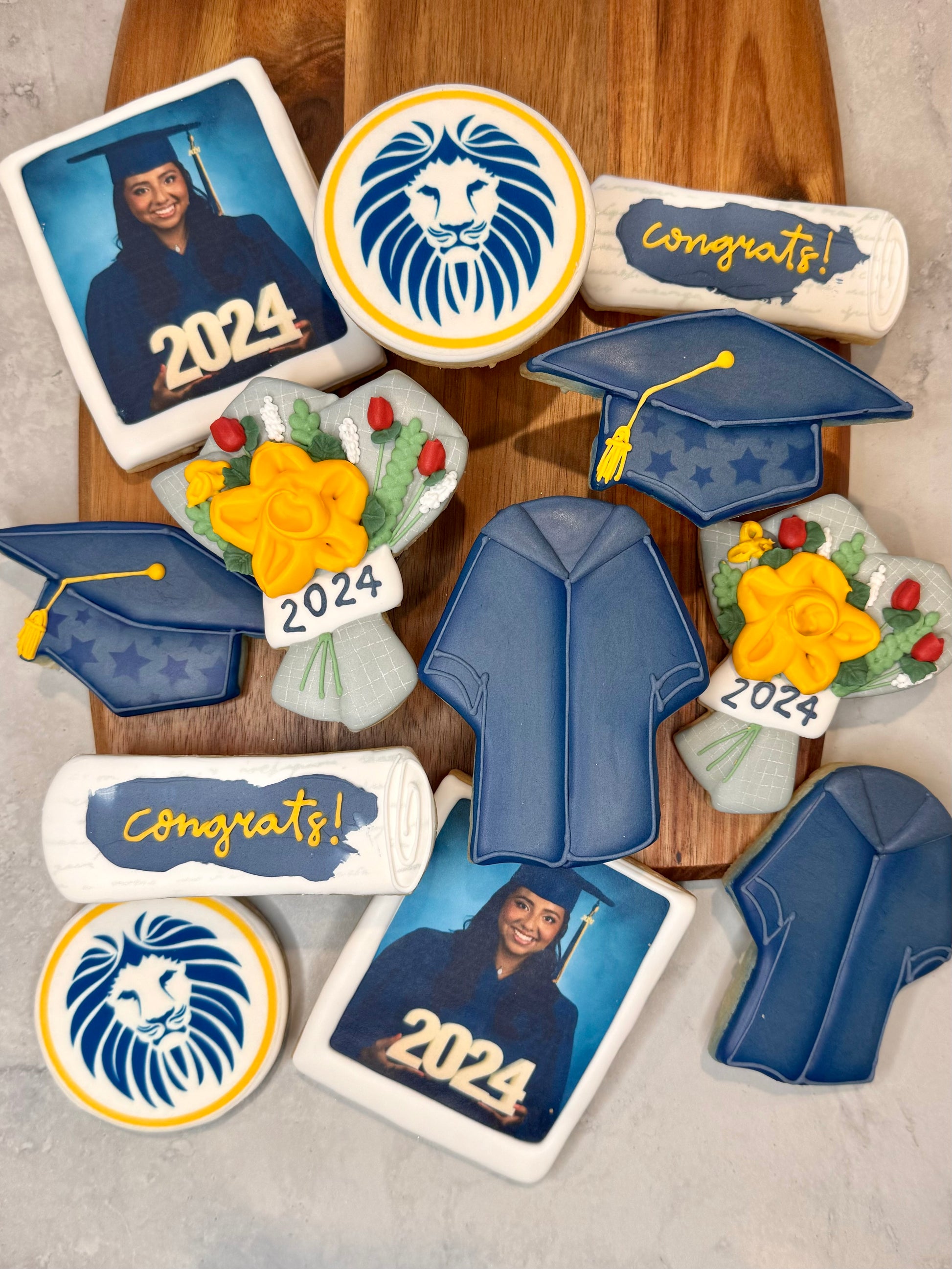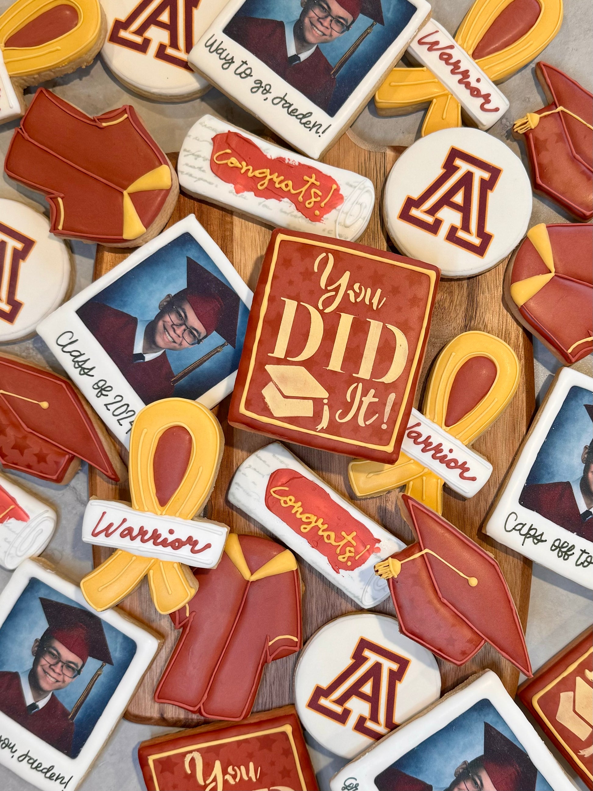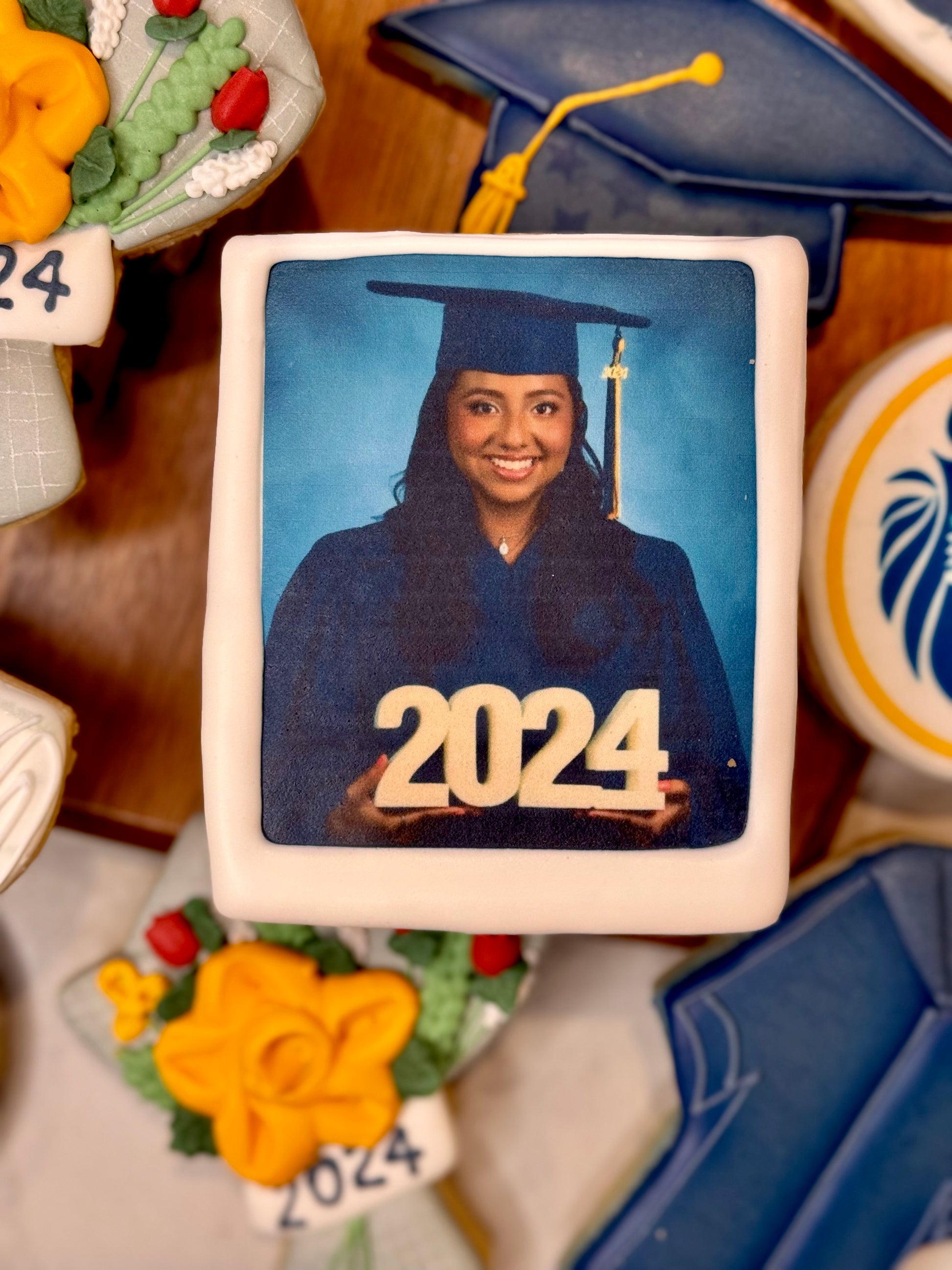 You have the option of adding a school logo on a 3 inch round, a Polaroid graduation picture, and/or a “You Did It!” 3x4 rectangle.